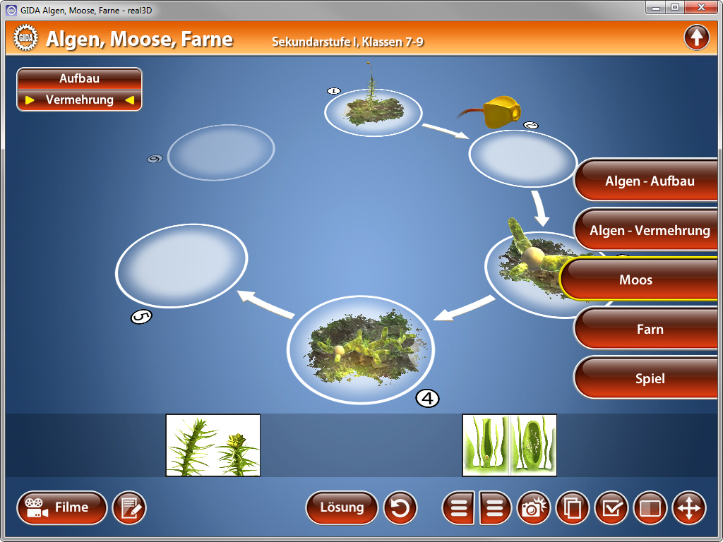 Anhand von bewegbaren 3D-Modellen können einzelne Teilbereiche des Themas "Algen, Moose, Farne" von Lehrern demonstriert und von Schülern aktiv nachvollzogen werden: Algen-Aufbau, Algen-Vermehrung, Moos, Farn, Spiel.