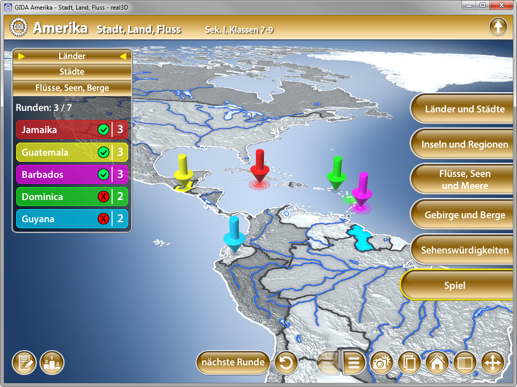 Anhand von bewegbaren 3D-Modellen in den 6 Arbeitsbereichen (Länder und Städte - Inseln und Regionen - Flüsse, Seen und Meere - Gebirge und Berge - Sehenswürdigkeiten - Spiel) können verschiedene geographische Gegebenheiten von Amerika demonstriert und von Schülern aktiv nachvollzogen werden.