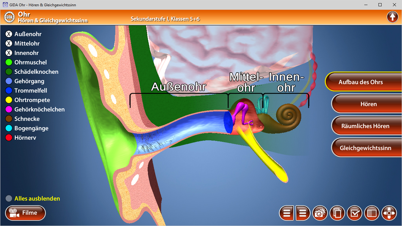 Anhand von bewegbaren 3D-Modellen in den 11 Arbeitsbereichen (Aufbau des Ohrs, Aufbau der Schnecke, Hören, Räumliches Hören, Gleichgewichtssinn, Aufbau und Funktion der Macula, Aufbau und Funktion der Cupula) können einzelne Teilbereiche des Themas „Ohr – Hören & Gleichgewichtssinn“ von Lehrern demonstriert und von Schülern aktiv nachvollzogen werden.