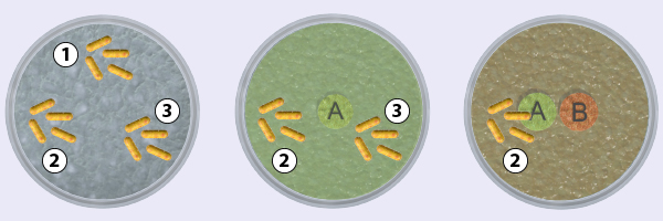 Ordne die drei dargestellten Bakterienstämme I-III den Kolonien 1-3 in den Petrischalen zu!